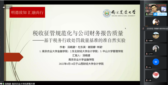 2022年6月14日,6776永利集团举行了第157次学术论坛,由南京农业大学汤晓健博士做学术报告:税收征管规范化与公司财务报告质量。