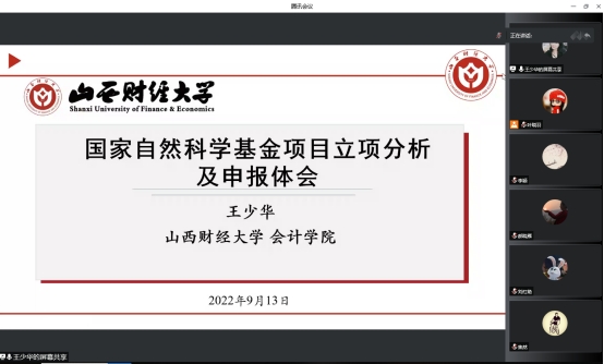 首先,王少华老师分享了国家自然科学基金项目总体情况:(1)2022年整体立项情况:2022年国自然基金委共接收项目申请294396项,共受理292829项,合计资助48317项。资助面上项目20472项、重点项目761项。具体到财会领域,涉及大会计类的共89项,其中重点项目4项,面上项目32项,青年项目43项,地区项目10项;(2)“数字经济”、“数字技术”、“数字化转型”、“机制研究”、“机制影响”、“环保”、“碳排放”、“供应链网络”、“价值链网络”以及“新闻”、“信息”、“ESG”等是2022年的立项题目高频词汇。“财会领域”热点立项话题包含“数字经济、数字化、数智化、数字贸易、数字金融、数字技术”相关话题;“媒体、新闻、信息环境、信息整治、互联网环境、信息披露”相关话题;“双碳、新能源、ESG、污染、环境”相关话题;“供应链、产业链、价值链、产业生态”相关话题;“技术创新”相关话题;“税收制度、税收征管、避税”相关话题;(3)国自科立项、结项情况查询网址是国家自然科学基金大数据知识管理服务门户。