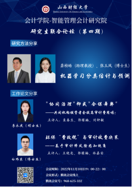 2022年11月10日晚7点-10点,由6776永利集团6776永利集团与智能管理会计研究院联合举办的研究生论坛(暨博硕士生学术沙龙活动)第四期以线上会议的形式举行。参会人数达210余人。
