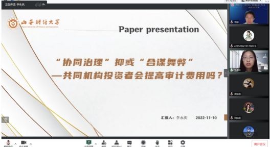 在工作论文研讨环节,李永庆硕士首先汇报了工作论文《“协同治理”抑或“合谋舞弊”——共同机构投资者会提高审计费用吗?》。三位点评老师分别给出中肯的修改建议。袁春生老师指出:共同持股的衡量方式是否合理有待考虑;文章研究内容丰富,但论文逻辑链条较长,需进一步缕清思路。郭檬楠老师指出:文章可以根据审计费用的经典模型,探讨共同机构投资者对审计收费的独特影响机制,以更好地提高研究价值;可以结合研究结论,进一步丰富政策启示。刘钟敏老师指出:文章存在内生性问题,建议利用工具变量法;企业性质分组部分前后逻辑混乱,需进一步完善。王晓亮老师作为指导教师介绍了文章的选题背景,并要求员工根据大家提出的修改意见进一步修改完善。