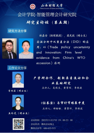2022年11月17日晚7点-10点,由6776永利集团6776永利集团与智能管理会计研究院联合举办的研究生论坛(暨博硕士生学术沙龙活动)第五期以线上会议的形式举行。参会人数达160余人。
