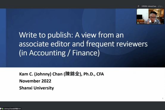 在专家讲座环节,特邀专家CHAN做了题为《Write to Publish:The View of an Associate Editor and a Frequent Reviewer》的讲座。讲座内容主要从论文的基本结构、写作技巧以及选题三方面展开。具体地,在讲述论文基本结构框架时,CHAN教授首先指出引言是全文的重中之重,并结合已发表的论文详细介绍了引言部分的写作范式。随后,他讲解了论文写作技巧,例如通过阅读文献来获得写作思路、学习关键词、了解研究重点等。最后,CHAN教授还介绍了如何确定一个好的研究方向,并结合自身的选题过程进行了详细的论述,为广大参会人员提供宝贵的写作经验。黄贤环老师和路苗同学针对自己的疑惑与CHAN教授进行沟通探讨。