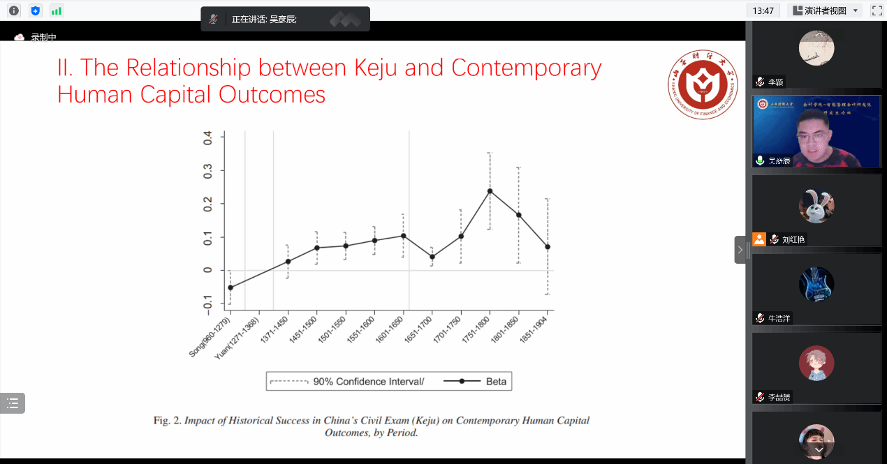 在研究方法分享环节,吴彦辰硕士分享了文章《Long Live Keju! The Persistent Effects of China’s Civil Examination System》的主要内容。林嘉安老师重点讲解了这篇文章中工具变量的运用,林老师耐心解答了刘红艳博士等同学的问题,包括机制检验的方法等。
