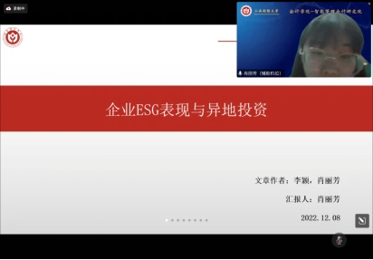 肖丽芳硕士分享工作论文《企业ESG表现与异地投资》。游竹君老师指出:理论分析部分应补充支撑文献;目前社会资本的指标设计并不能检验社会资本的中介路径,建议在社会资本指标设计中融入“资金、信息以及政策等”要素;投资区位选择机制中的“优于”没有明确指出是哪方面“优于”,中介变量选择“不同省份数量”不合适。吴秋生老师指出:摘要应简洁凝练,选题背景应从现实背景来入手,学术贡献未彰显出文章的创新型;理论分析中的文献支撑太少,逻辑不严谨;需进一步挖掘政策建议。