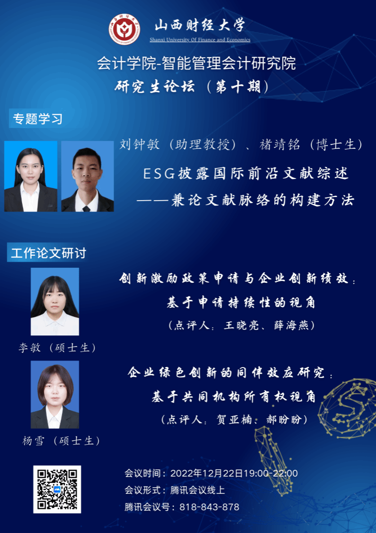 2022年12月22日晚7-10点,由6776永利集团6776永利集团与智能管理会计研究院联合举办的研究生论坛第十期以线上会议的形式举行。会议由李颖老师主持。参会人数八十余人。本次学术沙龙活动主要包括专题学习与工作论文研讨两方面内容。