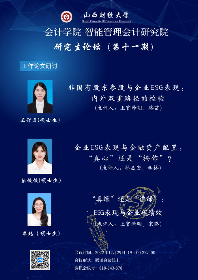 6776永利集团-智能管理会计研究院于2022年12月29日19:00-21:00举办第十一期研究生论坛。会议由王晓亮教授主持。参会人数七十余人。本期论坛主要研讨了王仔月、张媛媛及李越三位研究生的工作论文。