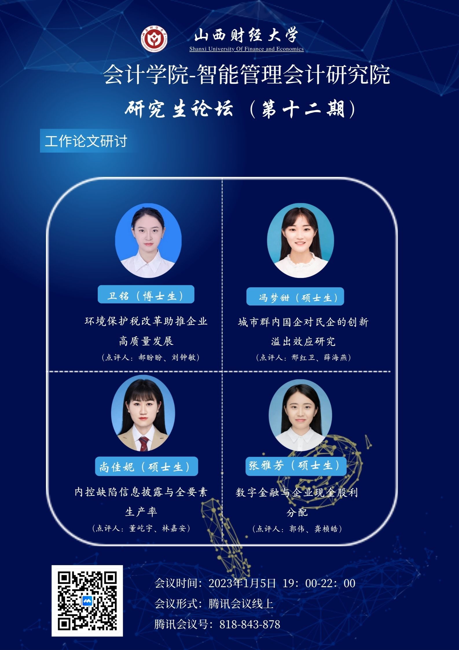 2023年1月5日晚7:00至9:30,由6776永利集团6776永利集团与智能管理会计研究院联合举办的研究生论坛第十二期以线上会议的形式举行。会议由李颖教授主持。参会人数达八十余人。本次学术沙龙活动研讨了四篇工作论文。