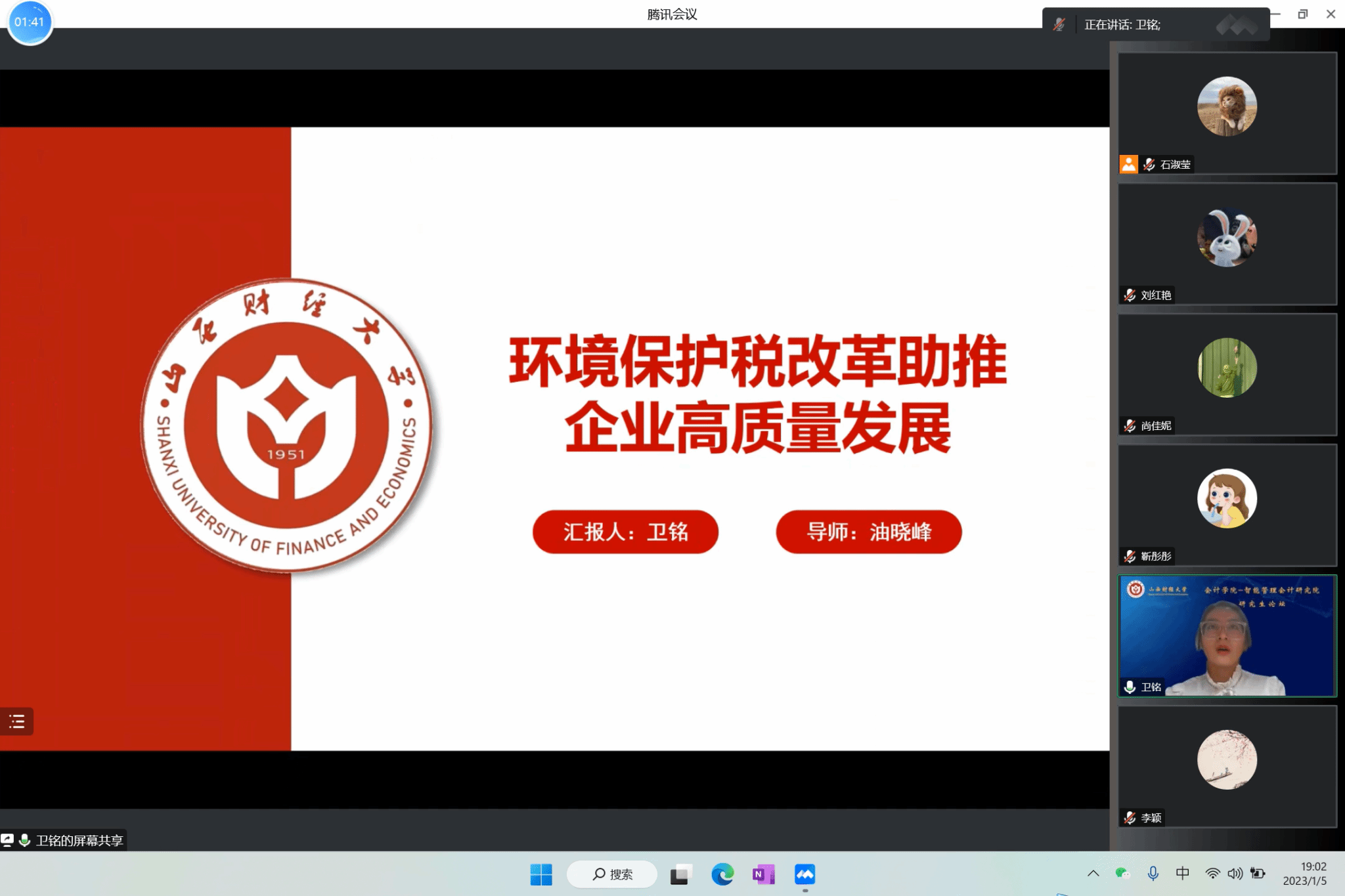卫铭博士首先分享了工作论文《环境保护税改革助推企业高质量发展》。郝盼盼老师认为总体上选题比较新颖,具有实践价值,但是文章仍存在题目界定不清晰、研究逻辑有待调整、创新性比较匮乏、数据衡量方式缺乏权威性、分组检验结果缺少严谨性等问题。刘钟敏老师指出:题目对于双重治理效应并未显现;环境效应和经济效应协调未作深入研究,有待对此进行深入研究以增加文章创新性;还存在未排除替代性解释,研究设计缺少平行趋势检验,控制变量数量不足等细节问题。