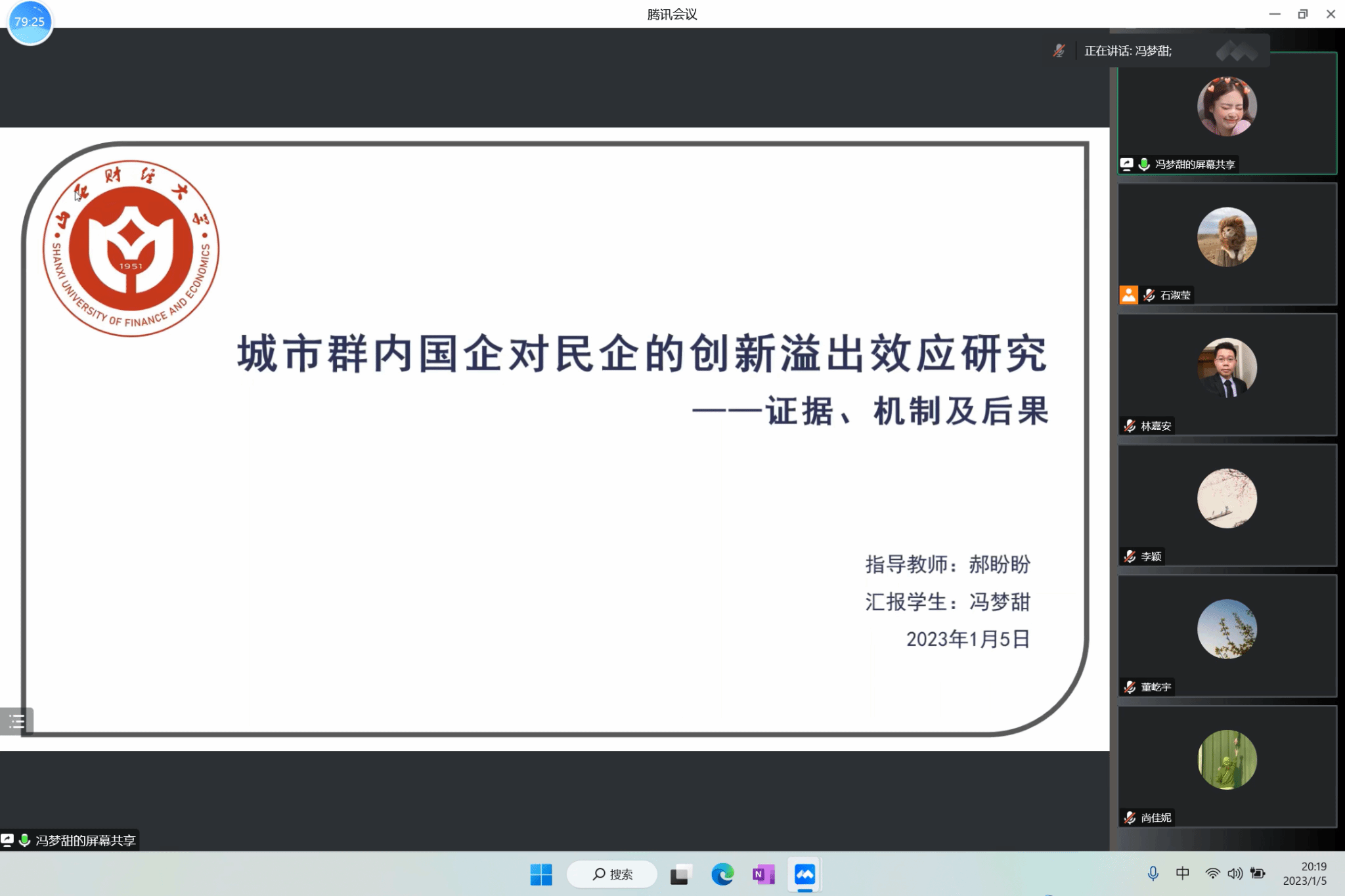 冯梦甜硕士汇报了题为《城市群内国企对民企的创新溢出效应研究》的工作论文。特邀专家山西大学邢红卫副教授和薛海燕老师分别进行点评。邢红卫老师指出文章反向因果问题严重;关于人才流动引发的创新溢出方向存在不确定性,人才流动机制检验存在歧义;宏观层面因素考虑不足等。薛海燕老师认为目前论文主要存在三个问题:一是主假设的提出缺乏理论依据,逻辑混乱;二是机制的理论分析与实证检验不匹配;三是内生性问题严重。