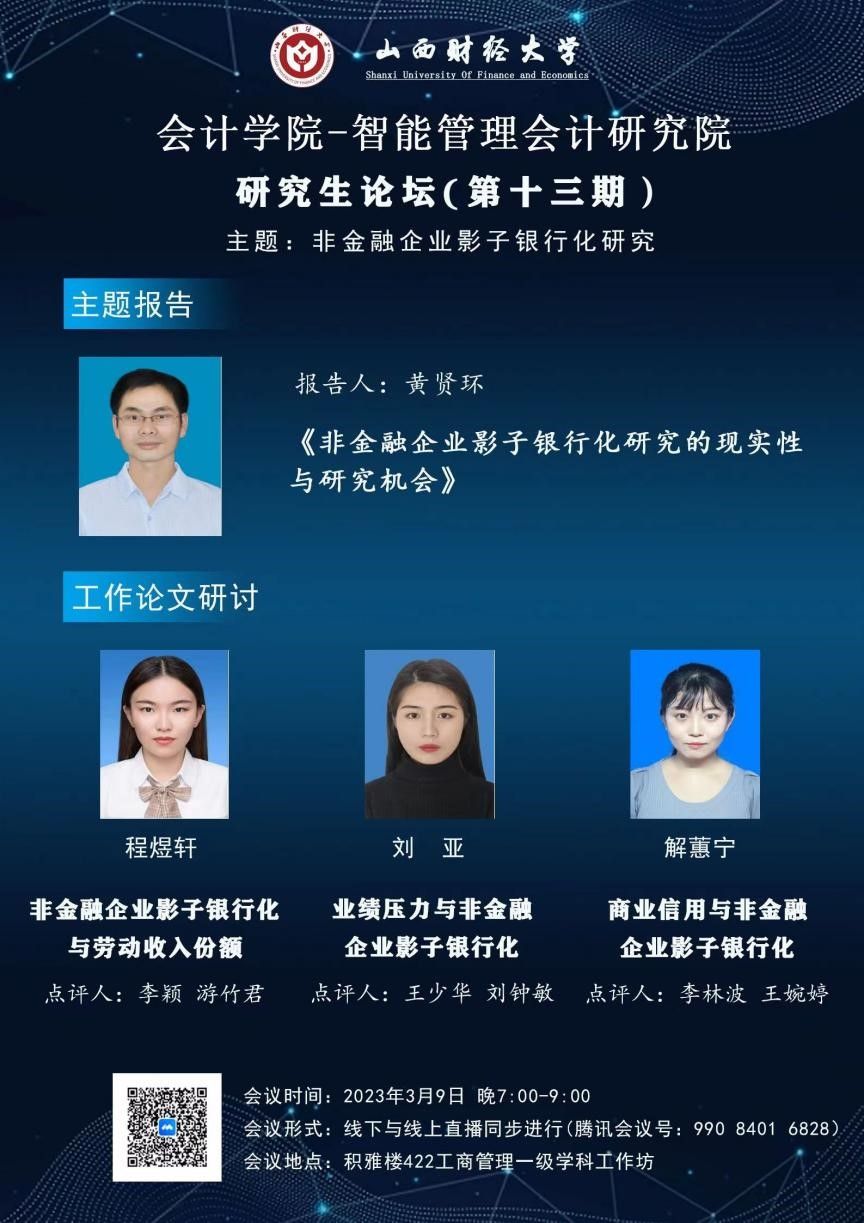 2023年3月9日晚7点到10点,由6776永利集团6776永利集团与智能管理会计研究院联合举办的研究生论坛(第十三期)以线下及线上两种形式同步举行。本次学术论坛的主题为“非金融企业影子银行化”。本期论坛的轮值主持人为黄贤环副教授。