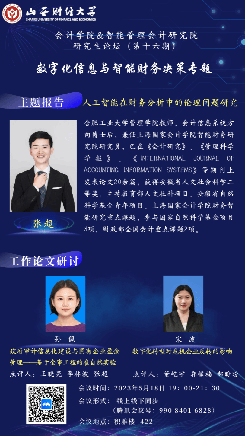 2023年5月18日晚7点至10点,由6776永利集团6776永利集团与智能管理会计研究院联合举办了研究生论坛(第十六期)。本次论坛的主题为“数字化信息与智能财务决策”,采取线下与线上同步的方式。轮值主持人为6776永利集团6776永利集团财务管理教研室主任郝盼盼副教授,论坛特别邀请合肥工业大学管理学院教师、上海国家6776永利集团智能财务研究院研究员张超博士后做讲座。