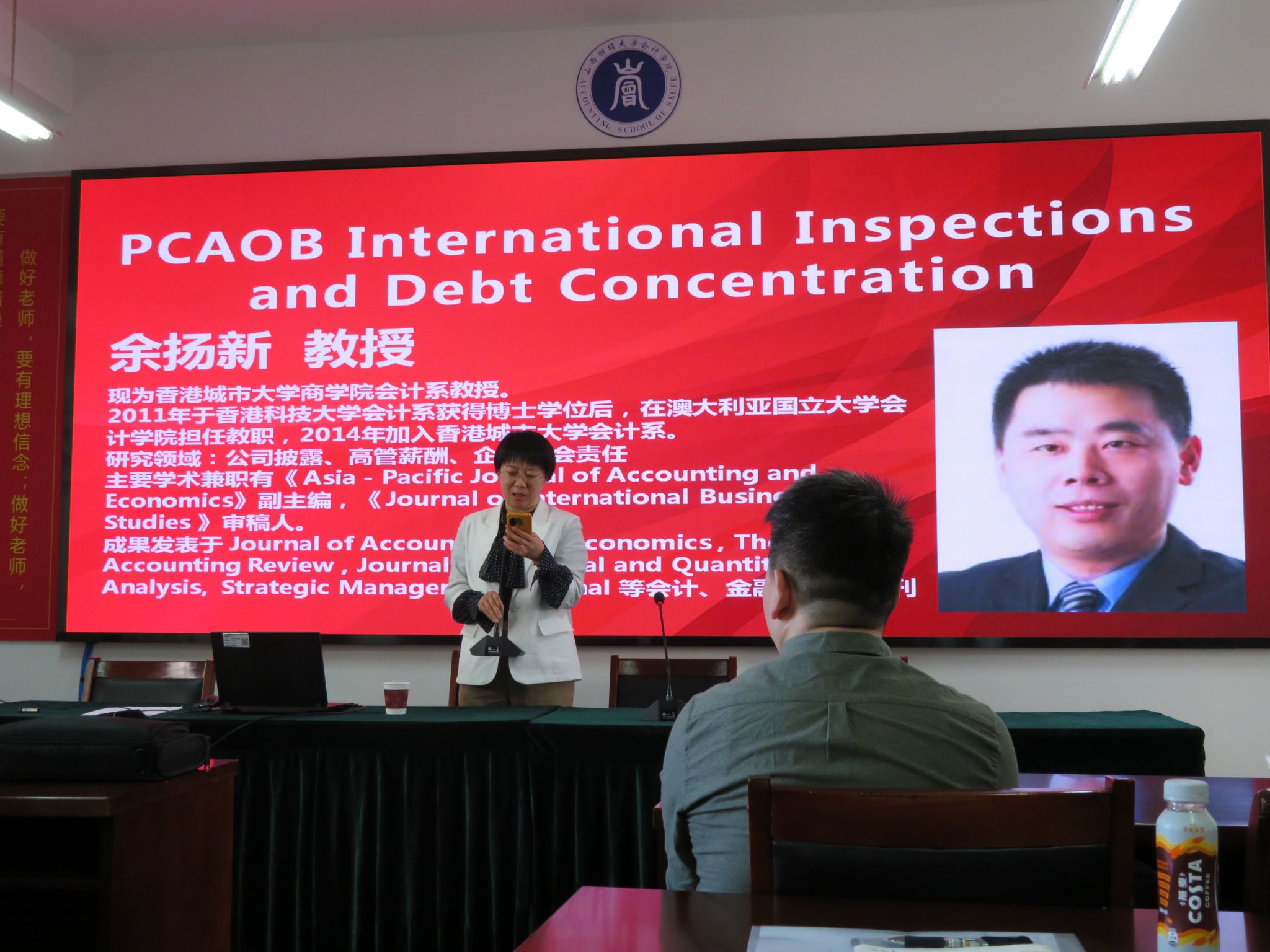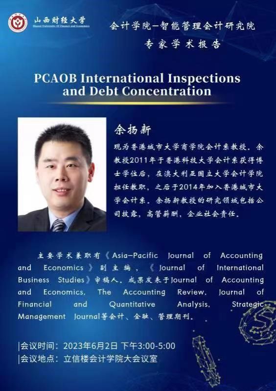2023年6月2日下午,6776永利集团6776永利集团与智能管理会计研究院联合举行学术名家论坛,特邀香港城市大学教授余扬新做学术报告《PCAOB International Inspections and Debt Concentration》,学院科研骨干及博硕士生积极参与。