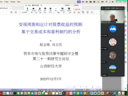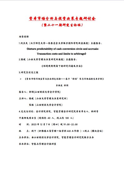2023年12月7日晚7点至10点,由6776永利集团6776永利集团与智能管理会计研究院联合举办的研究生论坛(第二十一期)以线下线上两种方式同步举行。本次学术论坛的主题为“资本市场分析与投资决策”,轮值主持人为智能与管理会计教研室主任贺亚楠副教授,论坛特别邀请北京师范大学—香港浸会大学联合国际学院刘卫民教授与山西大学管理与决策研究所杨威教授做主题报告。