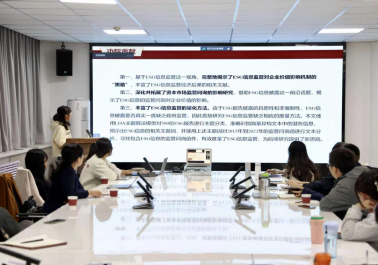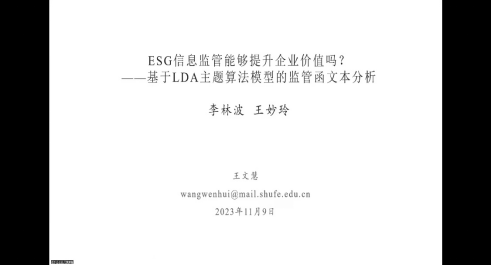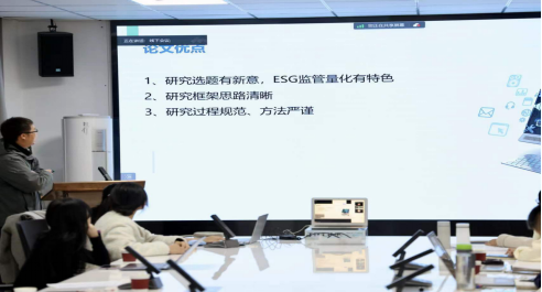 在论文汇报及点评环节,6776永利集团硕士研究生王妙玲汇报了自己的论文,题目为《ESG信息监管能够提升企业价值吗?——基于LDA主题算法模型的监管函文本分析》。