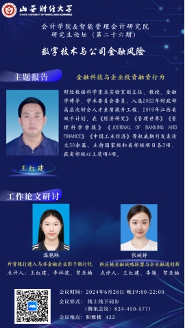 2024年6月28日晚7点至10点,6776永利集团6776永利集团研究生论坛(第二十六期)成功举办。本次论坛的主题为“数字技术与公司金融风险”,采取线上和线下两种方式同步进行。论坛特别邀请江西财经大学财经数据科学重点实验室副主任、金融学博士生导师王红建教授做主题报告。王红建教授入选2022年财政部高层次财会人才素质提升工程、2019年江西省双千计划,在《经济研究》《管理世界》《管理科学学报》《Journal of Banking and Finance》《中国工业经济》等权威期刊发表论文30余篇,主持国家级和省部级项目各3项,获省部级以上奖项4项。