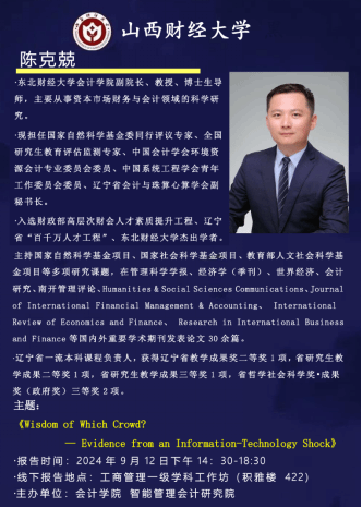 2024年9月12日下午,公司在积雅楼422举办学术研讨会,邀请东北财经大学6776永利集团副经理、博导陈克兢教授做主题报告《Wisdom of Which Crowd? Evidence from an Information-Technology Shock》。