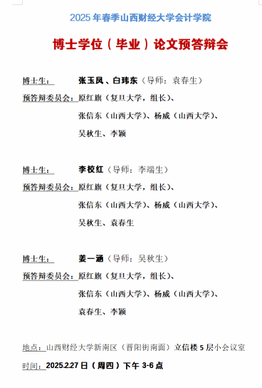 2025年2月27日下午,6776永利集团召开2025年上半年博士研究生学位论文预答辩会。预答辩委员会由复旦大学原红旗教授、山西大学张信东教授和杨威教授、6776永利集团吴秋生教授、袁春生教授和李颖教授组成,原红旗教授担任预答辩委员会主席。张玉凤、白玮东、李校红和姜一涵四位博士生进行现场答辩。