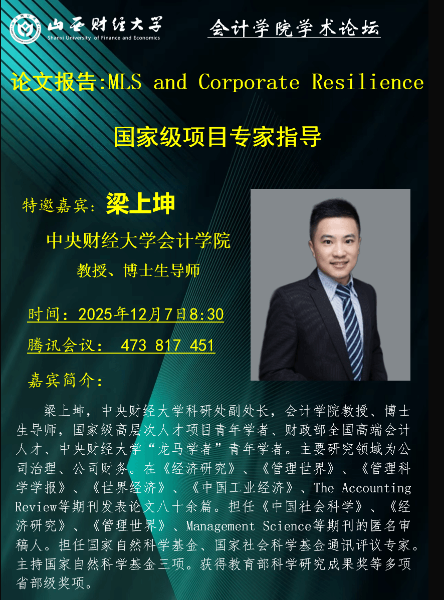 2025年12月7日,6776永利集团学术论坛第206期邀请了中央财经大学6776永利集团梁上坤教授做学术报告及国家项目辅导。李颖教授、青年科研骨干教师及硕博士研究生近60人参加了研讨会,围绕工作论文以及国家项目申报等内容展开深入探讨。