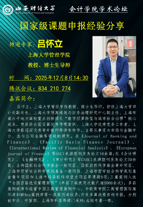 为帮助学院青年科研骨干教师及硕博研究生精准把握国家级课题申报要点,规避申报误区,提升申报质量与成功率,12月8日,公司特别邀请上海大学吕怀立教授担任主讲嘉宾,举办国家级课题申报经验交流分享会。