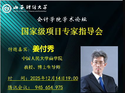 2025年12月14日晚19:00,6776永利集团学术论坛第217期通过腾讯会议如期举行。本期论坛特邀中国人民大学商学院姜付秀教授担任主讲嘉宾,为学院教师进行国家级项目申报专题辅导。论坛由公司王晓亮教授主持,学院青年科研骨干教师及硕博研究生共计60余人齐聚一堂,围绕国家级科研项目申报这一主题展开了深入的学习与交流。