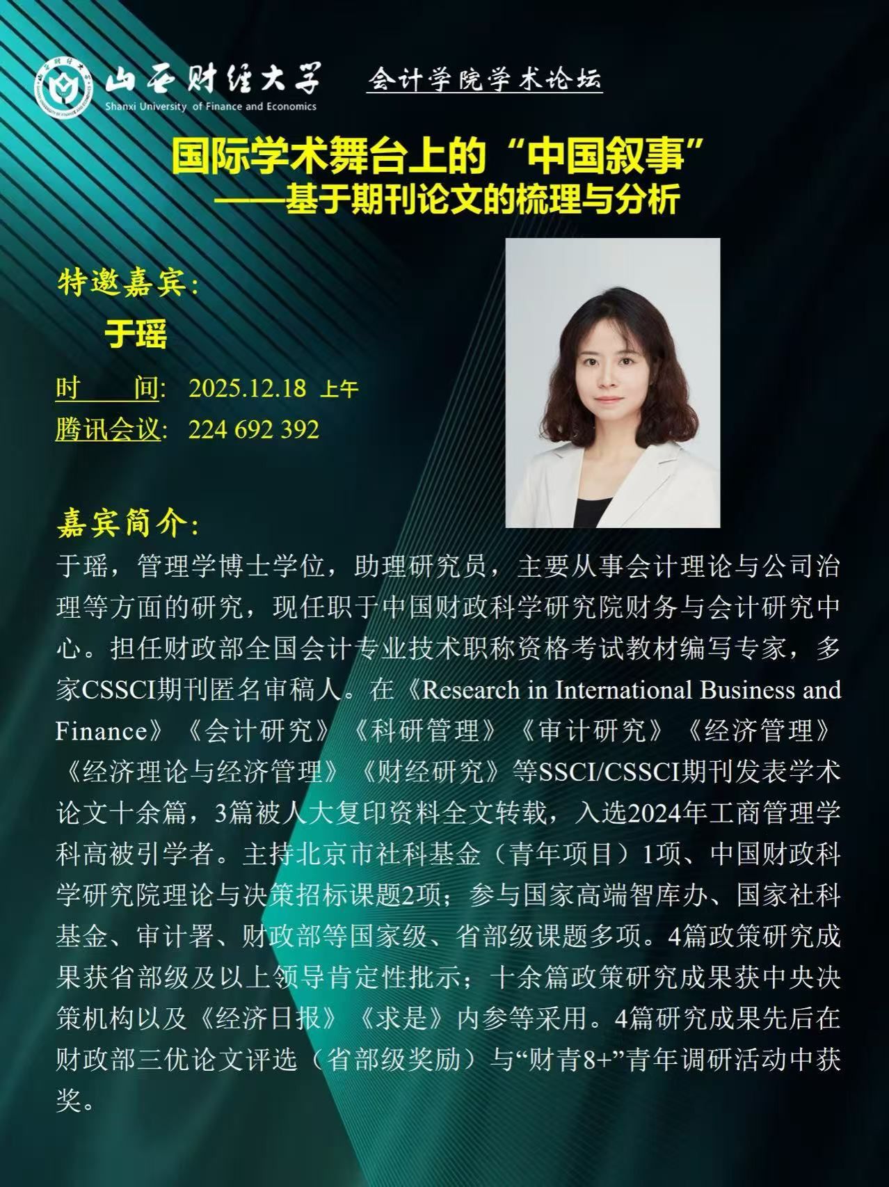 于瑶博士的报告围绕四大核心板块展开,逻辑清晰、内容详实,系统梳理了中国会计学者在国际学术领域的研究成果与发展脉络。