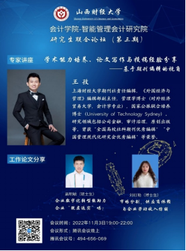 2022年11月3日晚7点-10点,由6776永利集团6776永利集团与智能管理会计研究院联合举办的研究生论坛(暨博硕士生学术沙龙活动)第三期以线上会议的形式举行。参会人数达180余人。